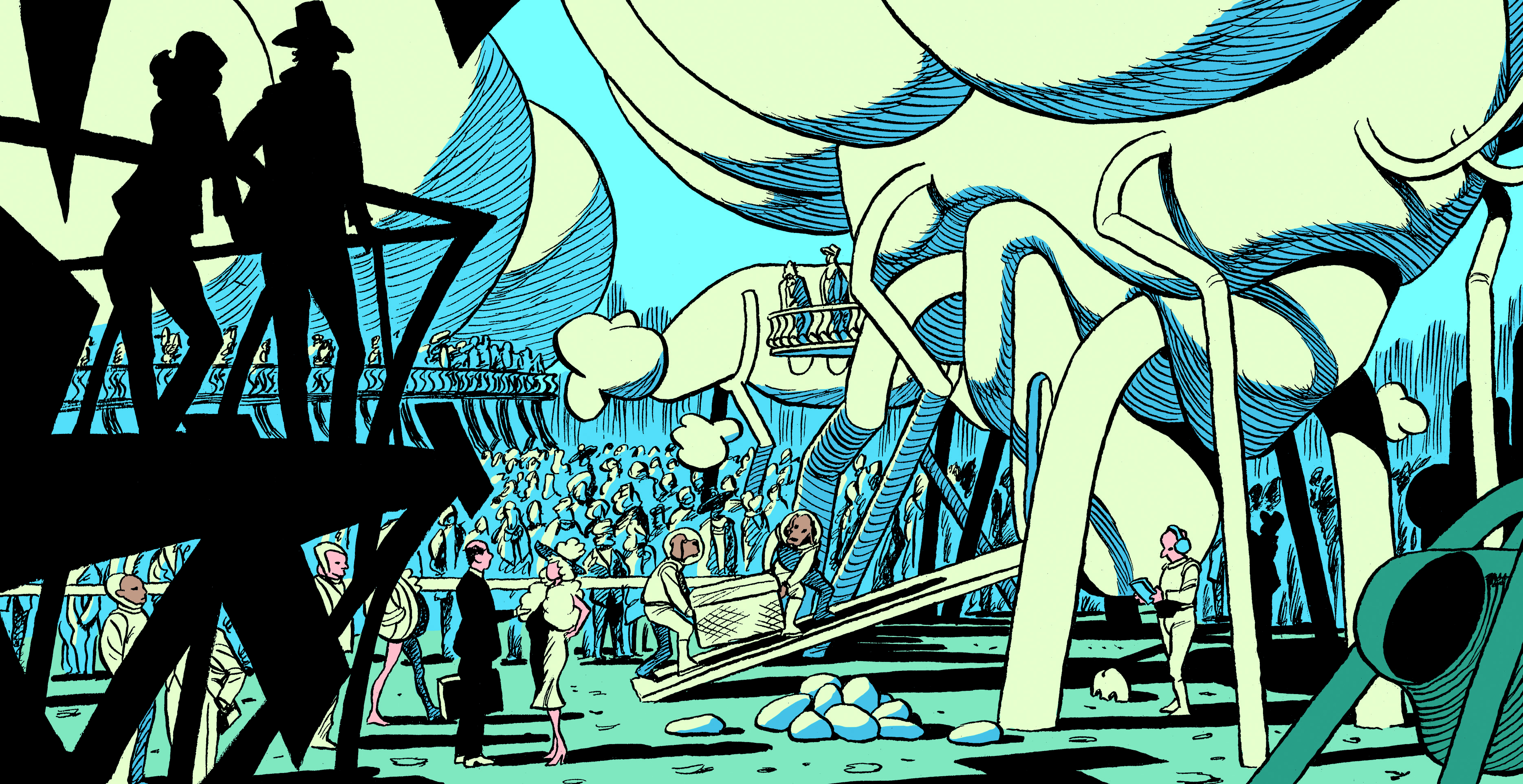 Écrites en 1985 pour Pichard, les trois dernières planches de L’Aéronef électrique représentent un casse-tête pour le dessinateur : foule de personnages, décor de superproduction hollywoodienne et engin spatial rétro- futuriste.