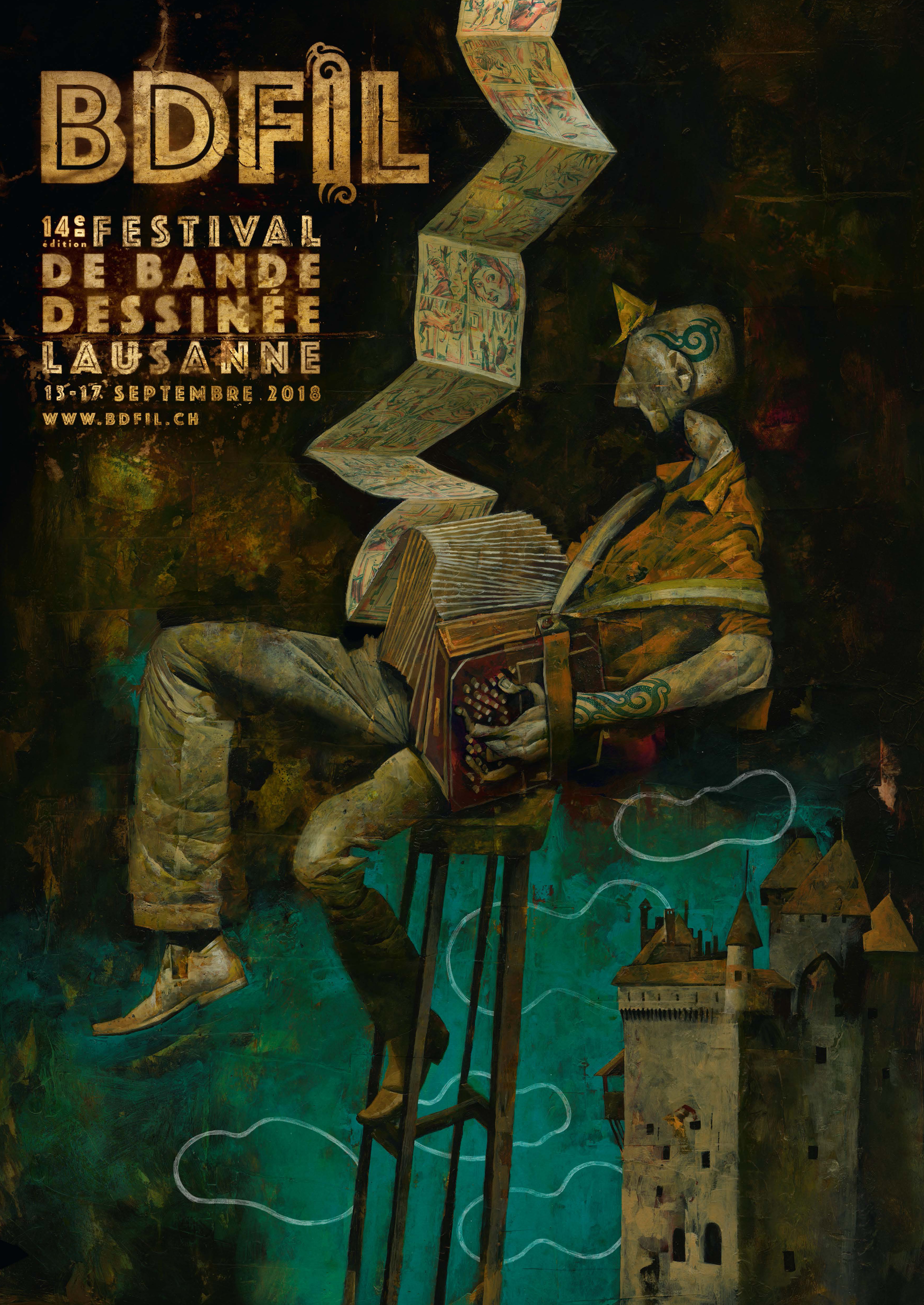 The most savagely beautiful, painterly, and musical poster. In the background the silhouette of Chillon Castle is visible, bastion of “Lemancholy” (the melancholy of Lake Leman) and birthplace of the great English Gothic mythos. Within this familiar scene, a clown musician sits perched on a barstool playing the bandoneon, while pages of a comic slip out from the bellows of his magic instrument.