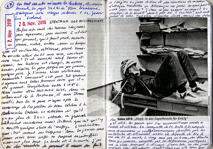 L’écrivain lausannois Yves Rosset lie une écriture manuscrite fine et des coupures de presse soigneusement découpées et collées, rendant à chaque page une unité plastique autonome. Il se sert de petits carnets où il inscrit ses chroniques de manière rigoureuse et intimiste, ses observations et ses interrogations sur le monde. A Standard/deluxe, il exposera 2 ou 3 carnets qui représentent un ensemble fini. Yves Rosset est un écrivain Suisse vivant à Berlin, né en 1965 à Lausanne (Aires de repos sur l’autoroute de l’information, Les oasis de transit, Bernard Campiche éditeur).