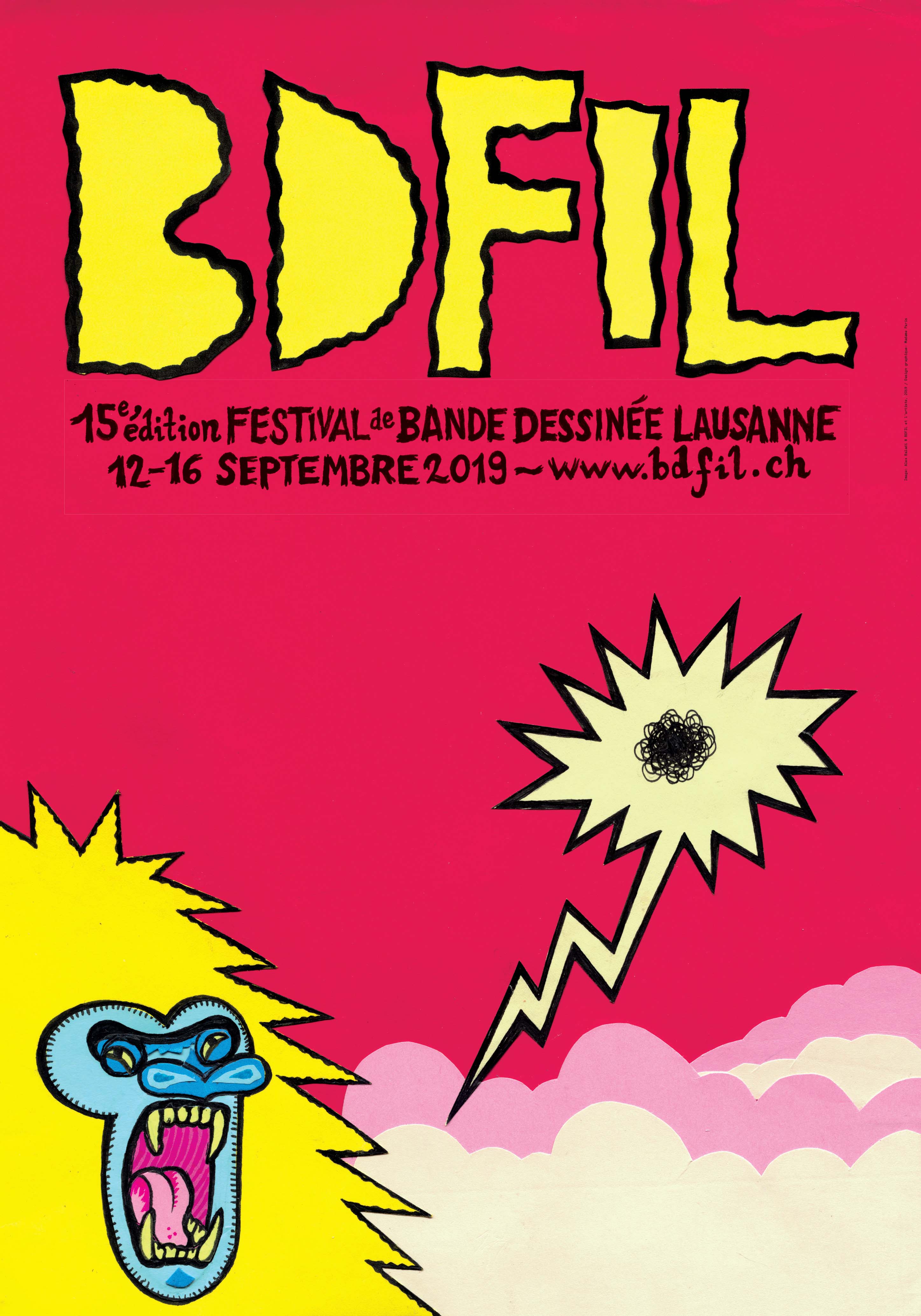 Rouge pétant, rose tendre, jaune de chrome, azur clair… Avec ses couleurs criardes et son gorille hurleur, on croirait presque à une affiche de cirque… Le cri renferme une pelote d’énervement, et la crinière hérissée épouse la forme du cri. Issu du monde sauvage, le motif est en apparence bien éloigné de notre Suisse tranquille, de Lausanne et du bleu Léman. Mais en apparence seulement : le grand singe est en effet échappé du Robinson suisse (Atrabile, 2019), dernière bande dessinée de Baladi. Et le Robinson suisse ne dit pas seulement la Suisse, mais aussi Lausanne, puisque le scénario en est dû à Isabelle de Montolieu, aristocrate lausannoise du début du XIXe siècle… On croirait presque à une affiche de cirque et c’est tant mieux : l’in-cro-yaaaaa-ble BDFIL installe à nouveau son grand chapiteau du 12 au 16 septembre à Lausanne.